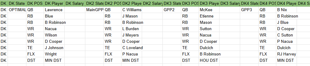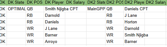 | FD | Slate | POS | Player | Salary | Slate | POS | Player | Salary | Slate | POS | Player | Salary | DK | DK Slate | DK POS | DK Player | DK Salary | DK2 Slate | DK2 POS | DK2 Player | DK2 Salary | DK3 Slate | DK3 POS | DK3 Player | DK3 Salary |