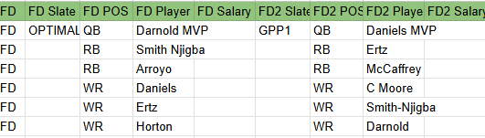 | FD | Slate | POS | Player | Salary | FD2 Slate | FD2 POS | FD2 Player | FD2 Salary | FD3 Slate | FD3 POS | FD3 Player | FD3 Salary | DK | Slate | POS | Player | Salary | Slate | POS | Player | Salary | Slate | POS | Player | Salary | Slate | POS | Player | Salary |
