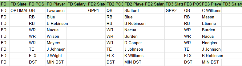 | FD | Slate | POS | Player | Salary | Slate | POS | Player | Salary | FD3 Slate | FD3 POS | FD3 Player | FD3 Salary | DK | DK Slate | DK POS | DK Player | DK Salary | DK2 Slate | DK2 POS | DK2 Player | DK2 Salary | DK3 Slate | DK3 POS | DK3 Player | DK3 Salary |